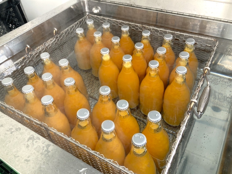 ボトリングしたジュースは、高温の殺菌槽に入れて殺菌します。